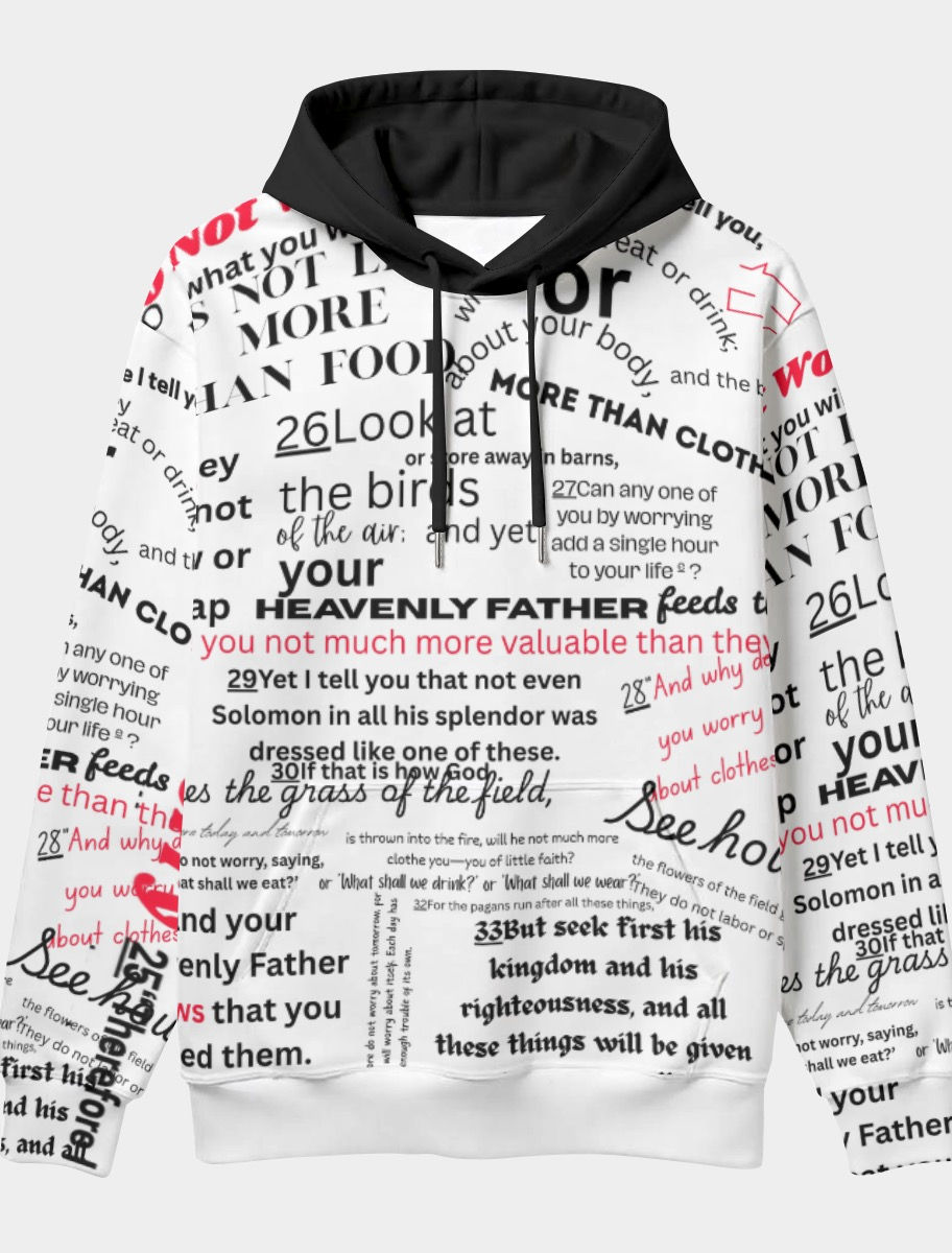Each line on the hoodie reminds you to let go of worry — your Heavenly Father knows your needs.